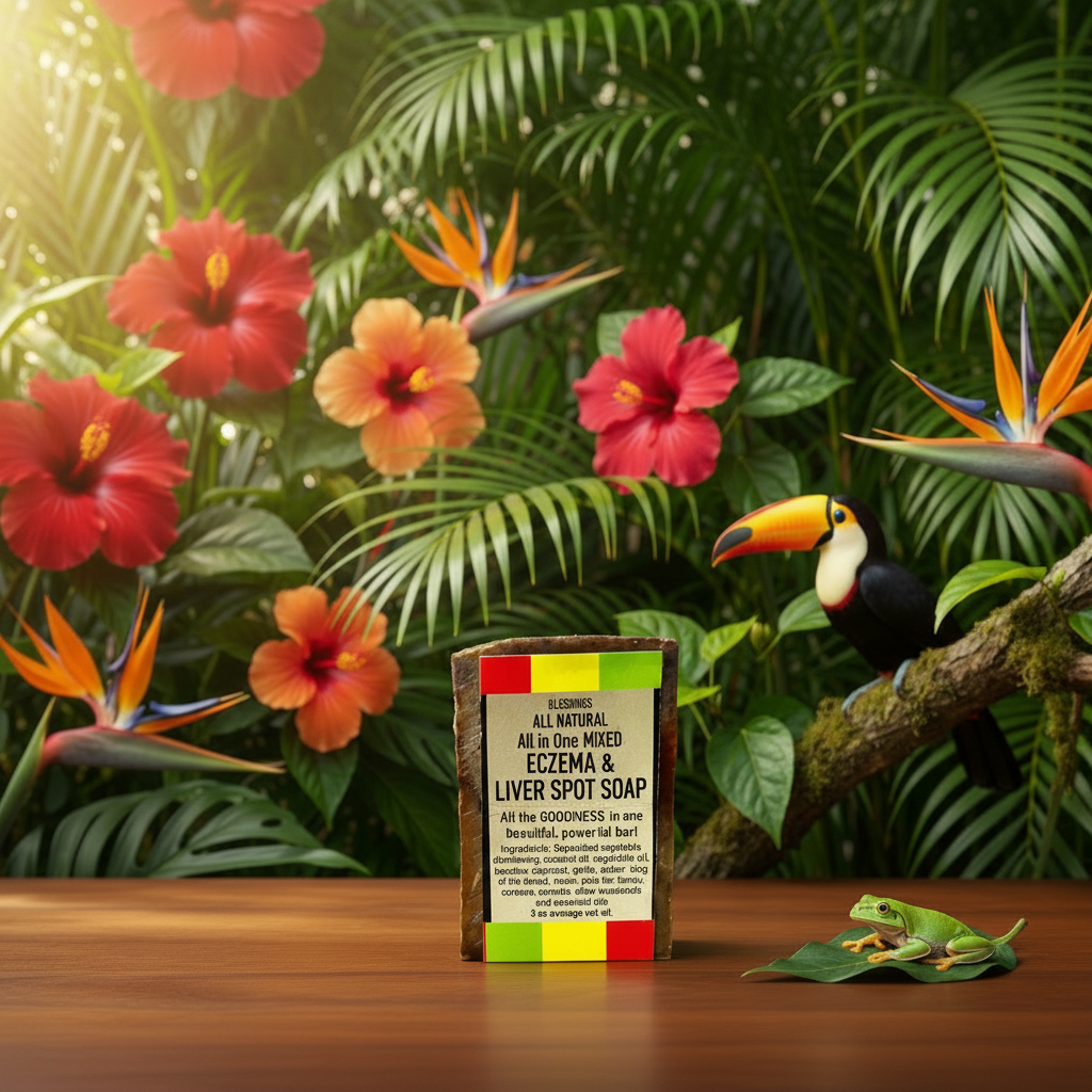 In Jamaica, tinea versicolor is often called “liver spots,” a common fungal concern that many people seek to manage naturally. This bar brings together our most trusted botanicals to support the look of clearer, calmer skin—while offering soothing comfort for those with eczema‑prone skin. The blend features king of the forest, neem, honey, and other botanicals we gather and prepare by hand, complemented by ingredients like pine tar, which we hope to one day craft ourselves.