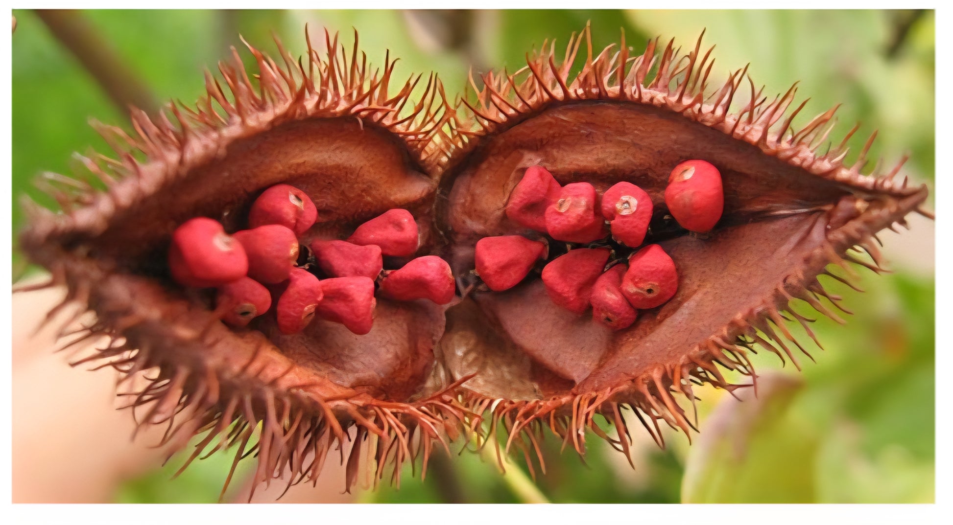 Annatto (/əˈnætoʊ/ or /əˈnɑːtoʊ/) is an orange-red condiment and food coloring derived from the seeds of the achiote tree (Bixa orellana), native to tropical parts of the Americas. It is often used to impart a yellow to red-orange color to foods, but sometimes also for its flavor and aroma. Its scent is described as "slightly peppery with a hint of nutmeg" and its flavor as "slightly nutty, sweet, and peppery".
